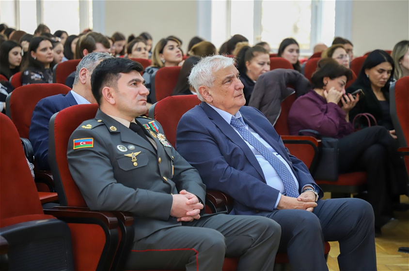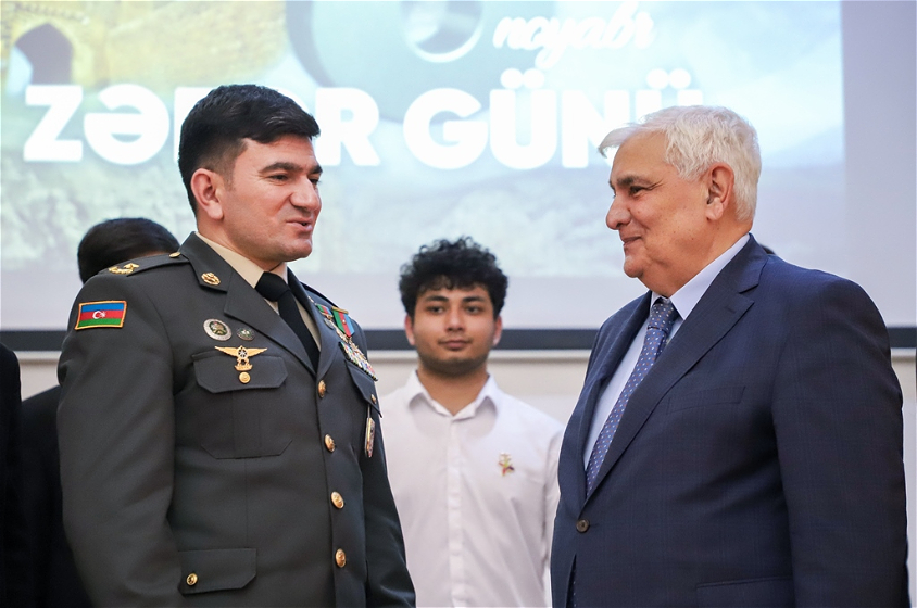 Rektor vurğulayıb ki, şəhidlərimizin qəhrəmanlığı, igid əsgər və zabitlərimizin rəşadəti tariximizin şanlı səhifəsini təşkil edir. Qarabağ torpaqlarının azad edilməsində iştirak edən bütün Azərbaycan oğullarına dərin minnətdarlıq ifadə olunub.